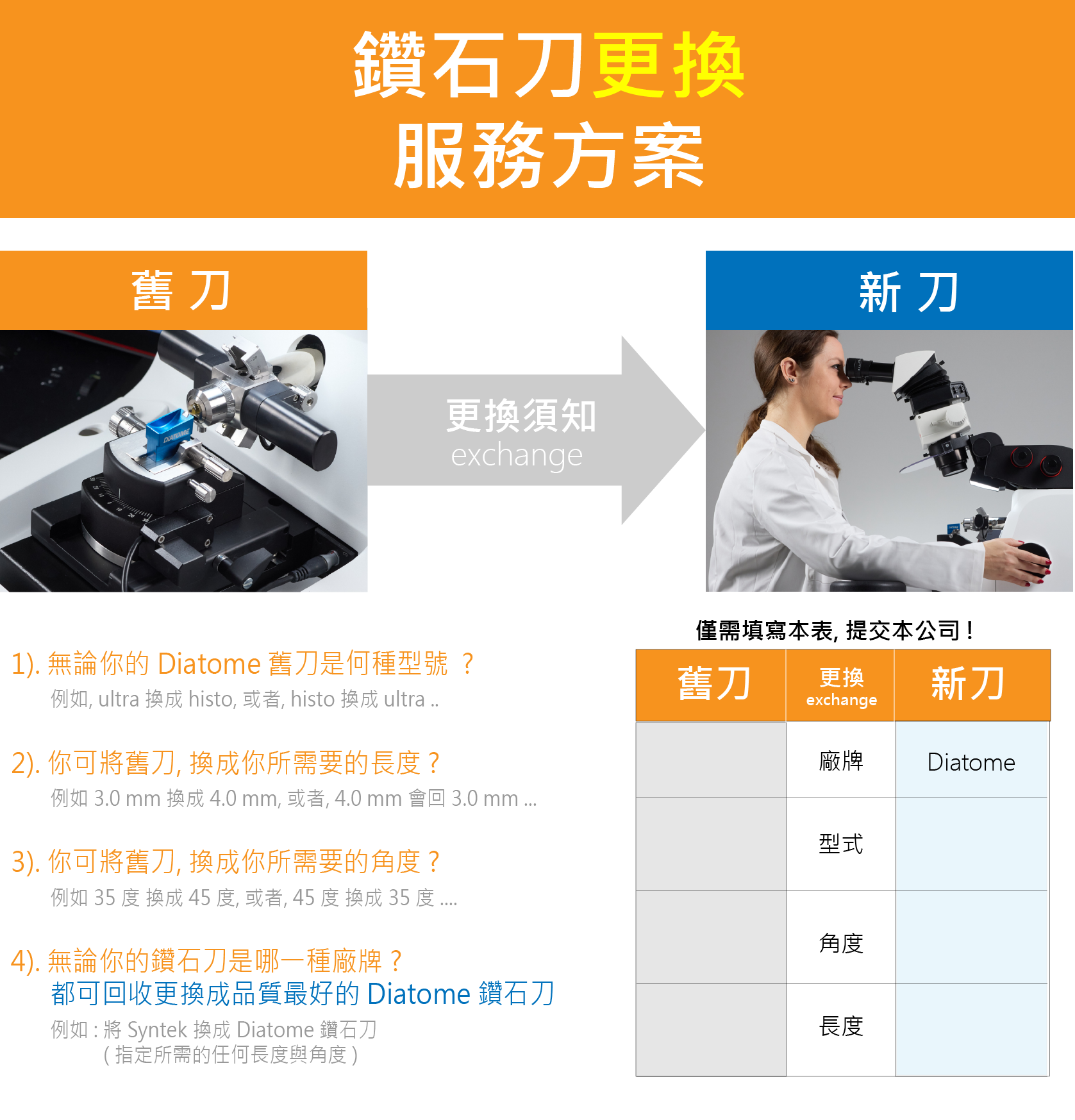 DiATOME (瑞士) (冷凍)超薄切片機的鑽石刀, 有三大列 : (參考 : 產品介紹與訂購明細)