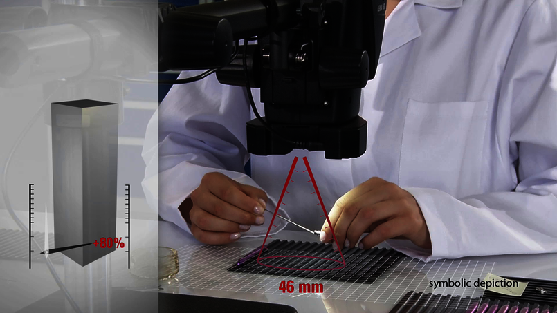 122 mm 超長的工作距離, 廣大的視野 46 mm, 可達 13.6 mm 景深,