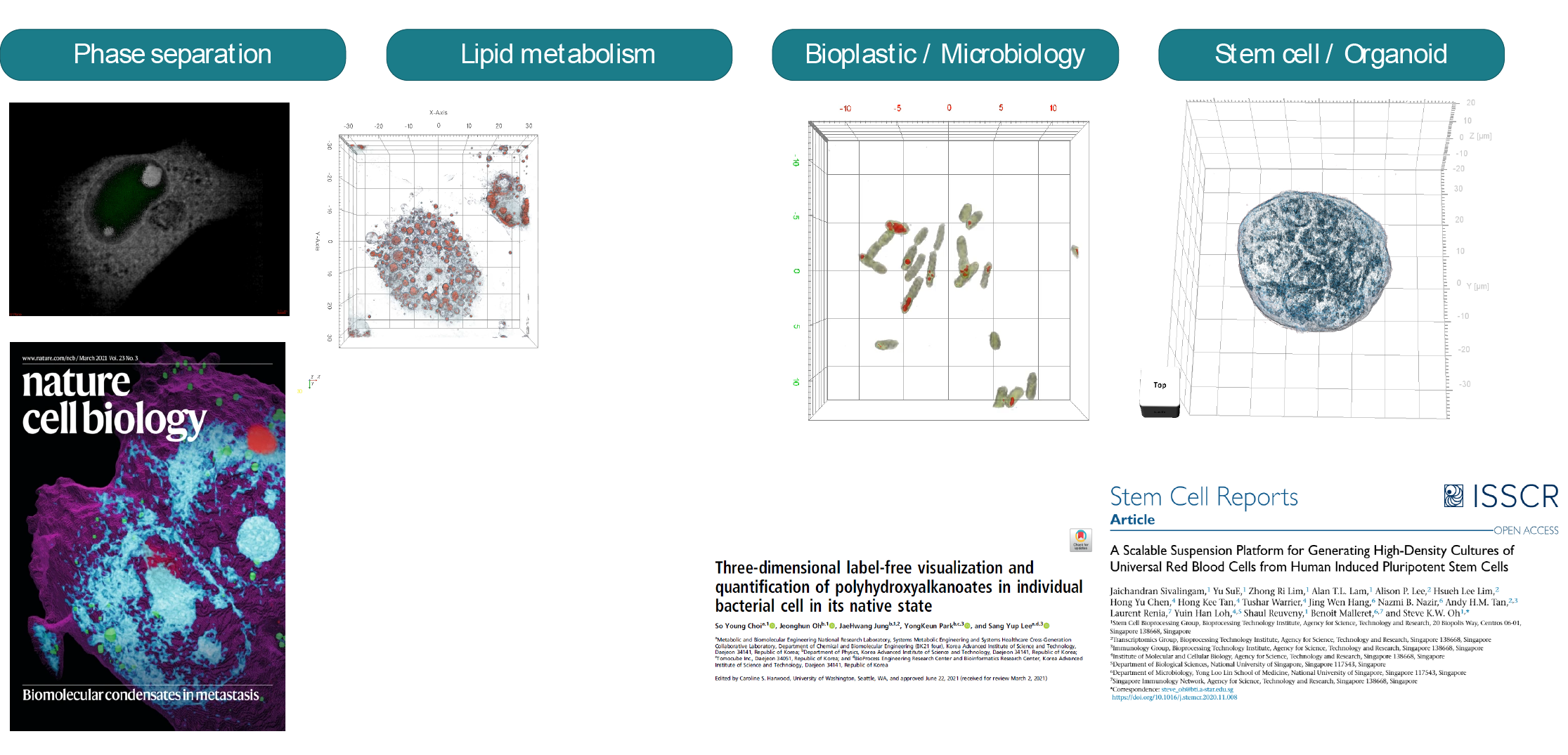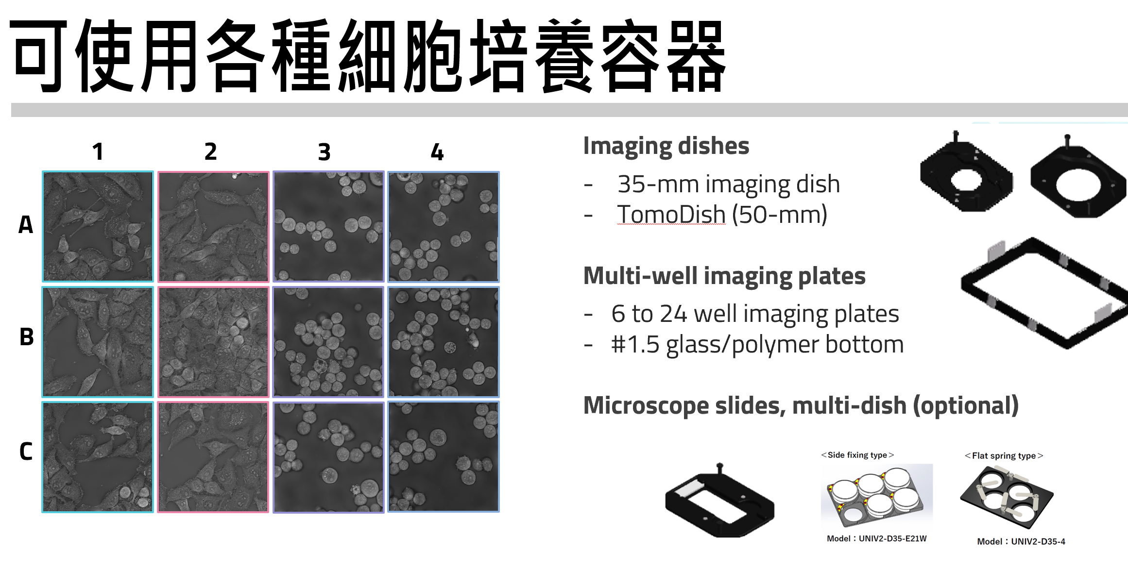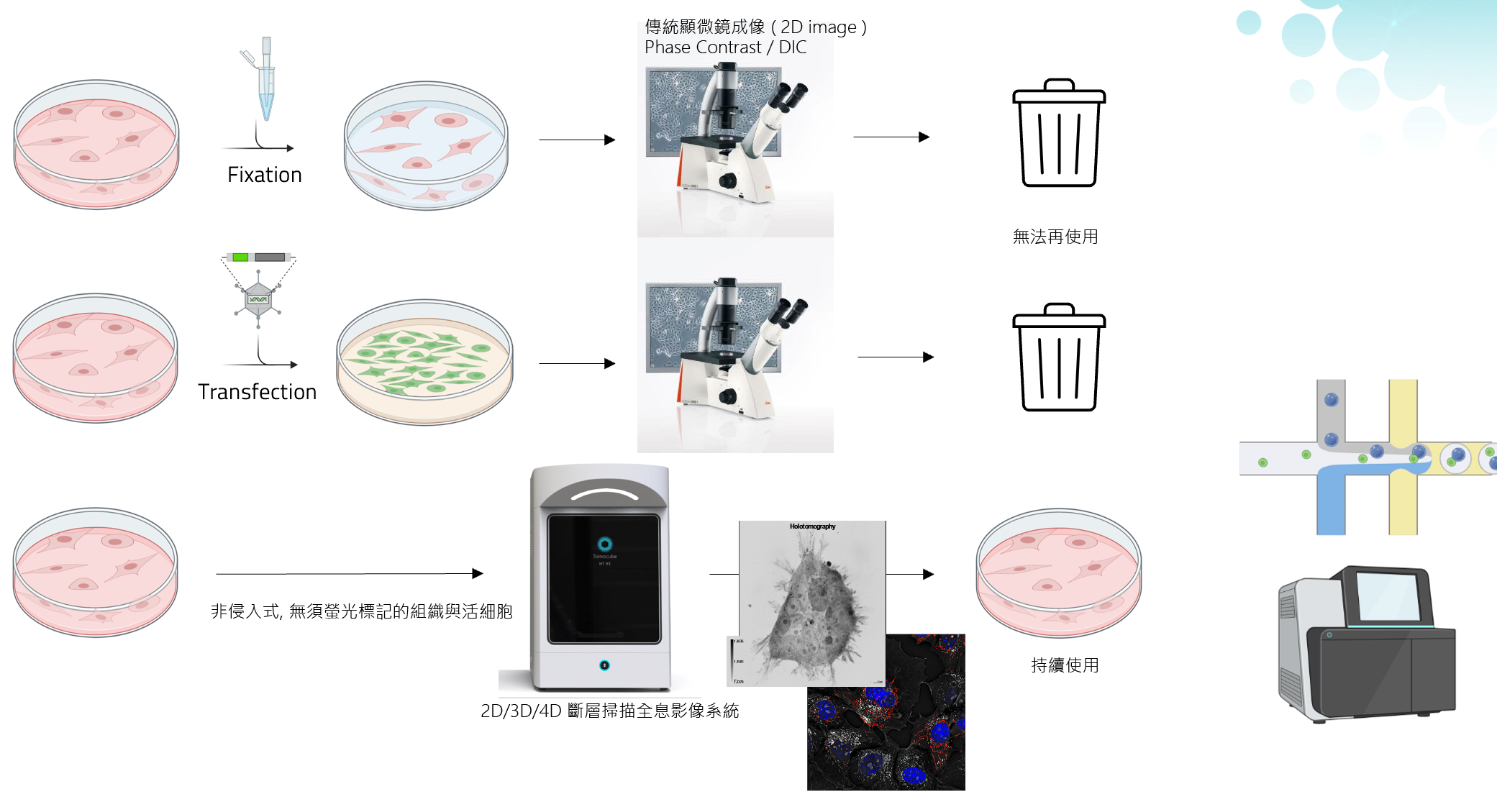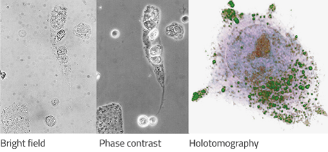這是新世代的活細胞成像技術, 突破傳統的明視野或相位差影像, 使用人員, 無需使用螢光染劑 (避免光毒害), 以全息繞射雷射光斷層掃描技術, 你可以快速或長時間取得活細胞的成像. 而且解析優於 110 nm 的光學解析, 讓你得到高解析的層析細胞級影像.