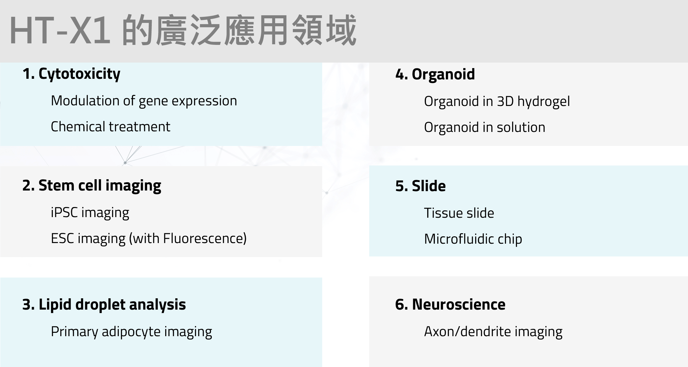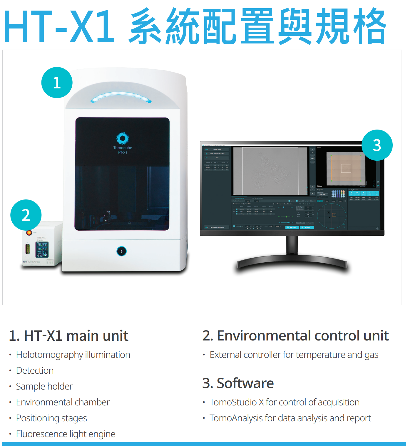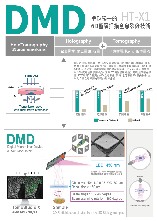Tomocube HT-X1 ( Holotomography system for Label-Free 3D/4D Live Cell Imaging ) 是一種非侵入式, 無須螢光標記的組織與活細胞 3D/4D 斷層掃描全息影像系統, 使用最新世代的全息成像Digital Micro-mirror Device ( DMD ) 掃描技術, 先進的 LED 360 度照射, 獨家的合成鏡頭的孔徑數值 (NA), 創造出最高的光學解析與最清晰的影像. TomoAnalysis人工智能智能 (AI) 量化分析軟體, 整合一體式的活細胞培養與高速動態成像, 取得超高解析的影像品質, 可精確定量分析.