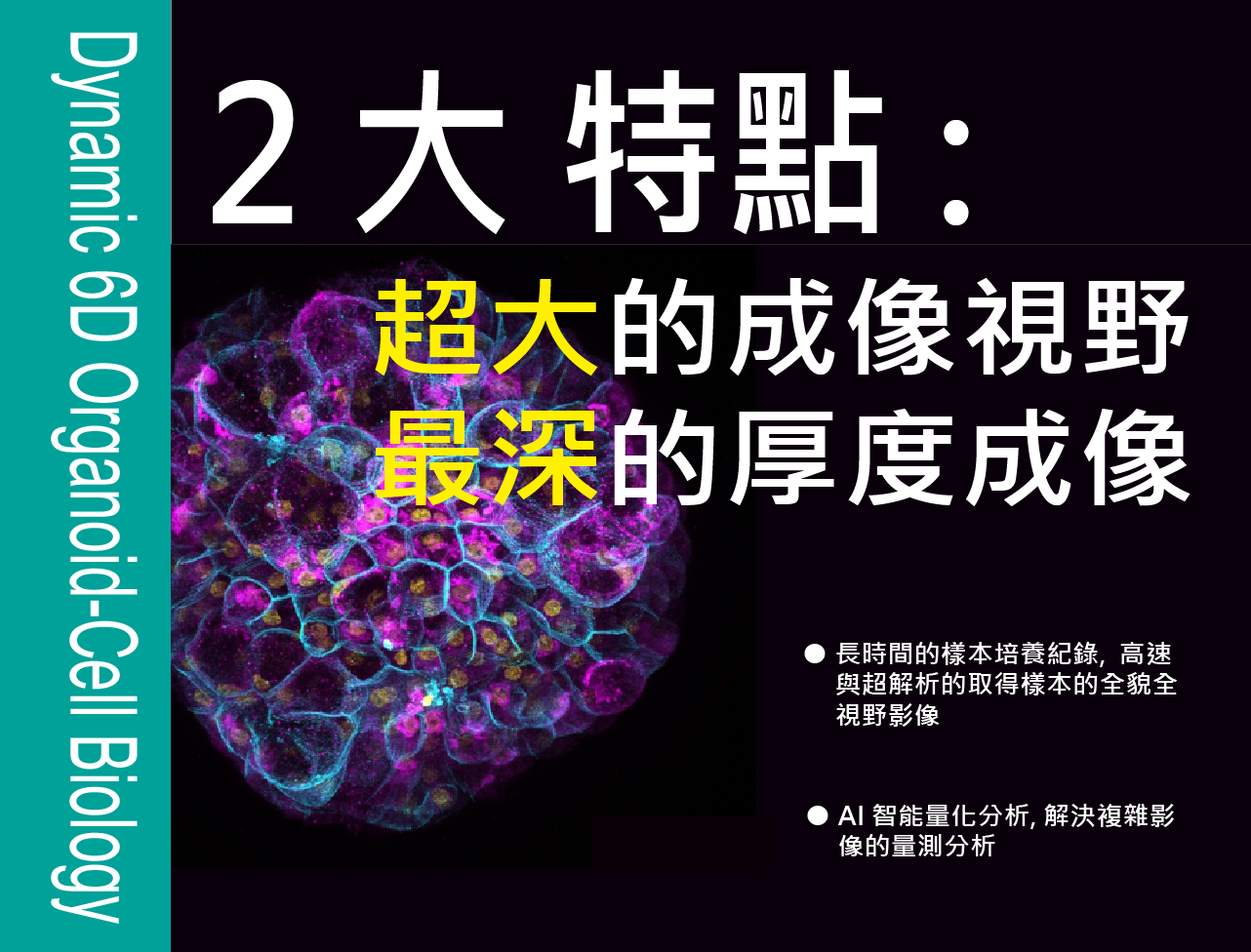 高速 3D 成像 > 2.5 fps, 4D 成像達 72 小時以上. 超高解析 XY/Z : 110/356 納米. 成像厚度可達 40 微米