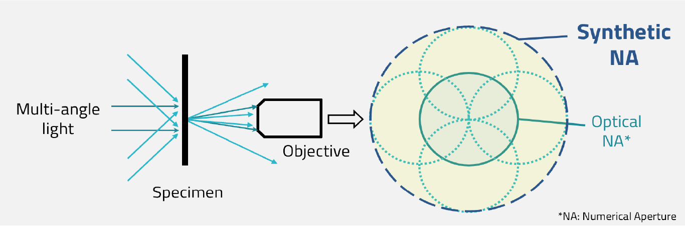 顯微鏡成像的光學解析取決於鏡頭的孔徑係數 ( NA 值 ) ! Tomocube HT-X1 獨家使用了創新的 合成光學孔徑係數 ( Synthetic Numerical Aperture), 如下圖所示. 透過合成從多個角度獲取的影像來克服光學解析度限制, 突破物鏡的物理 NA 值, 實現更高的合成 NA, 創造出最高的光學解析 !