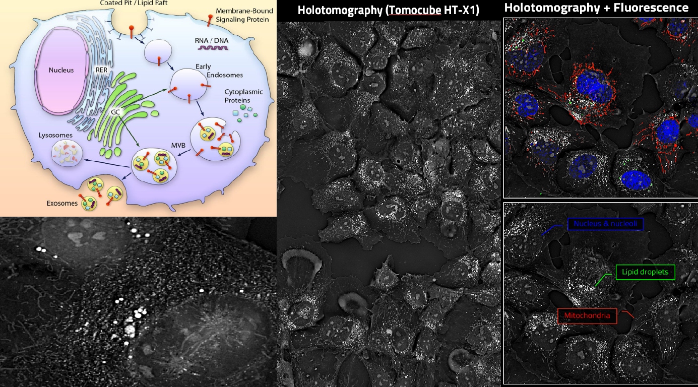 傳統上, 使用顯微鏡的相位差 (Phase Contrast) 和干涉對比 (DIC) 技術,觀察未經染色的活細胞或組織。 然而,此方法僅提供低解析的 2D 定性成像。HT-X1 是另一類全像斷層掃描 (Holotomograph : Holography + Tomography ) 提供定量 2D/3D/4D 全息影像。 直接測量樣品內的折射率 ( RI ) 變化,從而實現高解析的三維重建. 使其對於研究動態生物過程和更詳細地了解細胞結構特別有價值, HT-X1 全息影像技術可以結合螢光影像, 對活細胞內的細胞外囊泡(EVs)的3D運動進行成像和跟蹤 ! 例如深入探索單一細胞內的 粒線體(Mitochondrion), 外泌體 ( exosomes ):大小約30~150nm, 微囊泡 (microvesicles):大小約100~1000nm, 凋亡小體 (apoptotic bodies):大小約0~500nm ..........