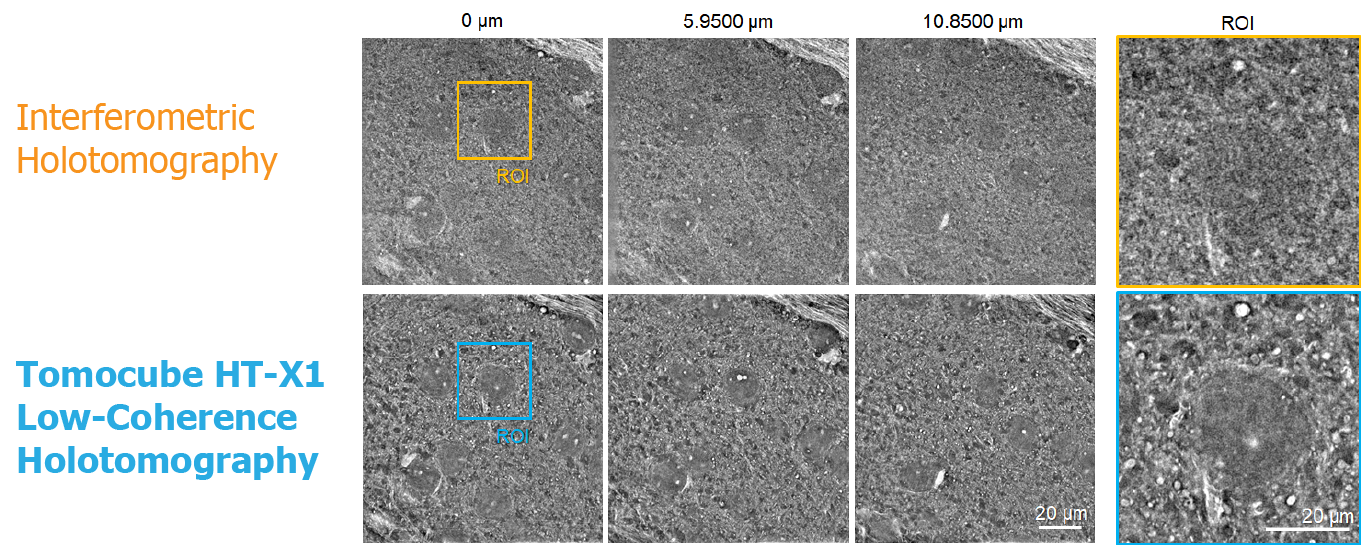 如果光源的同調長度愈長,代表干涉時兩道光束的光程差可以相差很大也會有干涉現象,反之如果光源的同調長度很短的話,那只有在兩道光束幾乎沒光程差的情況下才會形成干涉。所以, Tomocube HT-X1 是獨家使用狀新的低同調全息斷層掃描技術 ( Low-coherence Holotomography ), 創造最高的光學解析, 高對比效果, 快速影像擷取, 無需背景校準 就可取得清晰的影像.