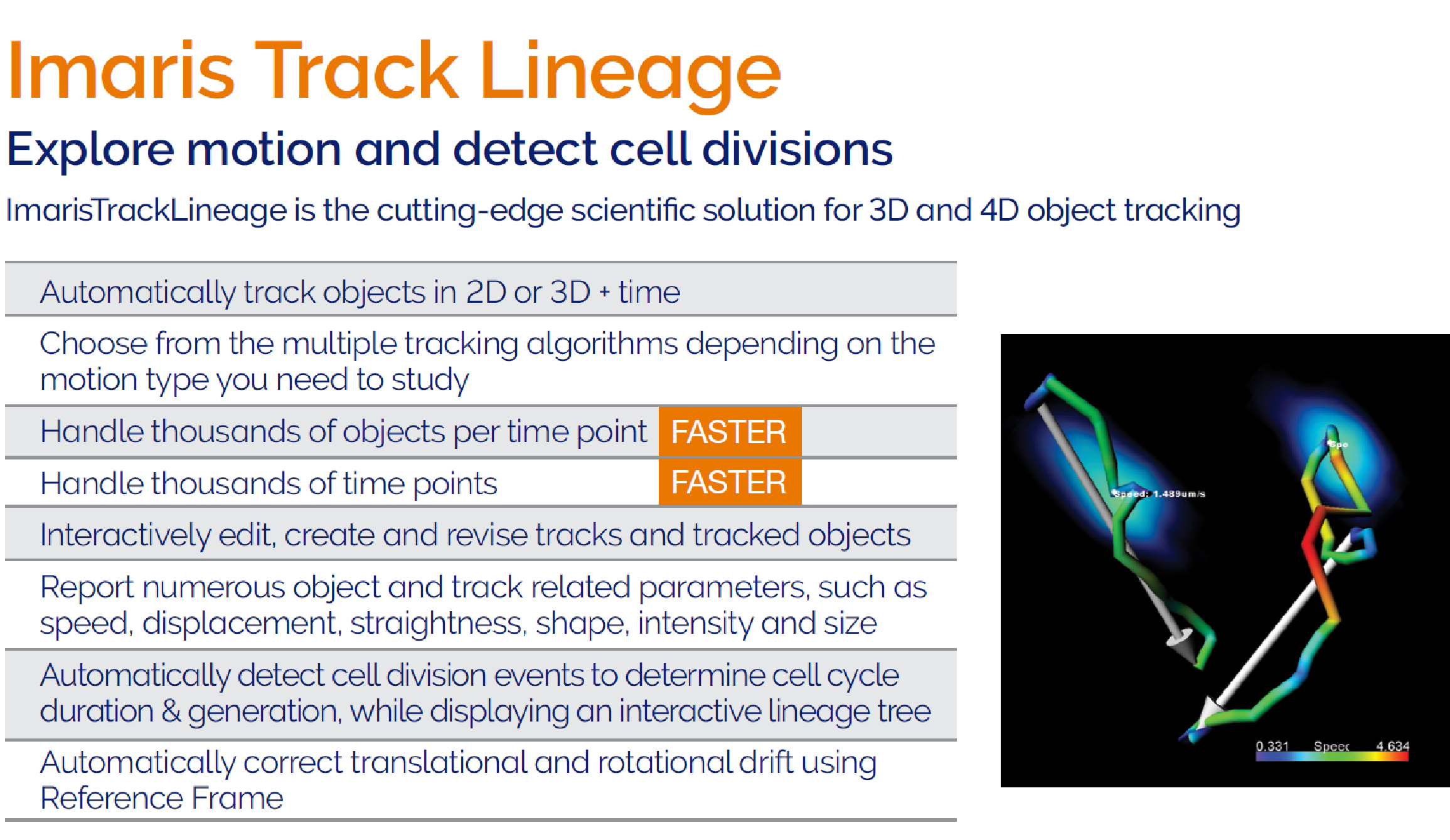 | Imaris TrackLineage - Track motion in 2D/3D, detect divisions, create lineage tree | ✓ | ✓ | ✓ | ✓ | |