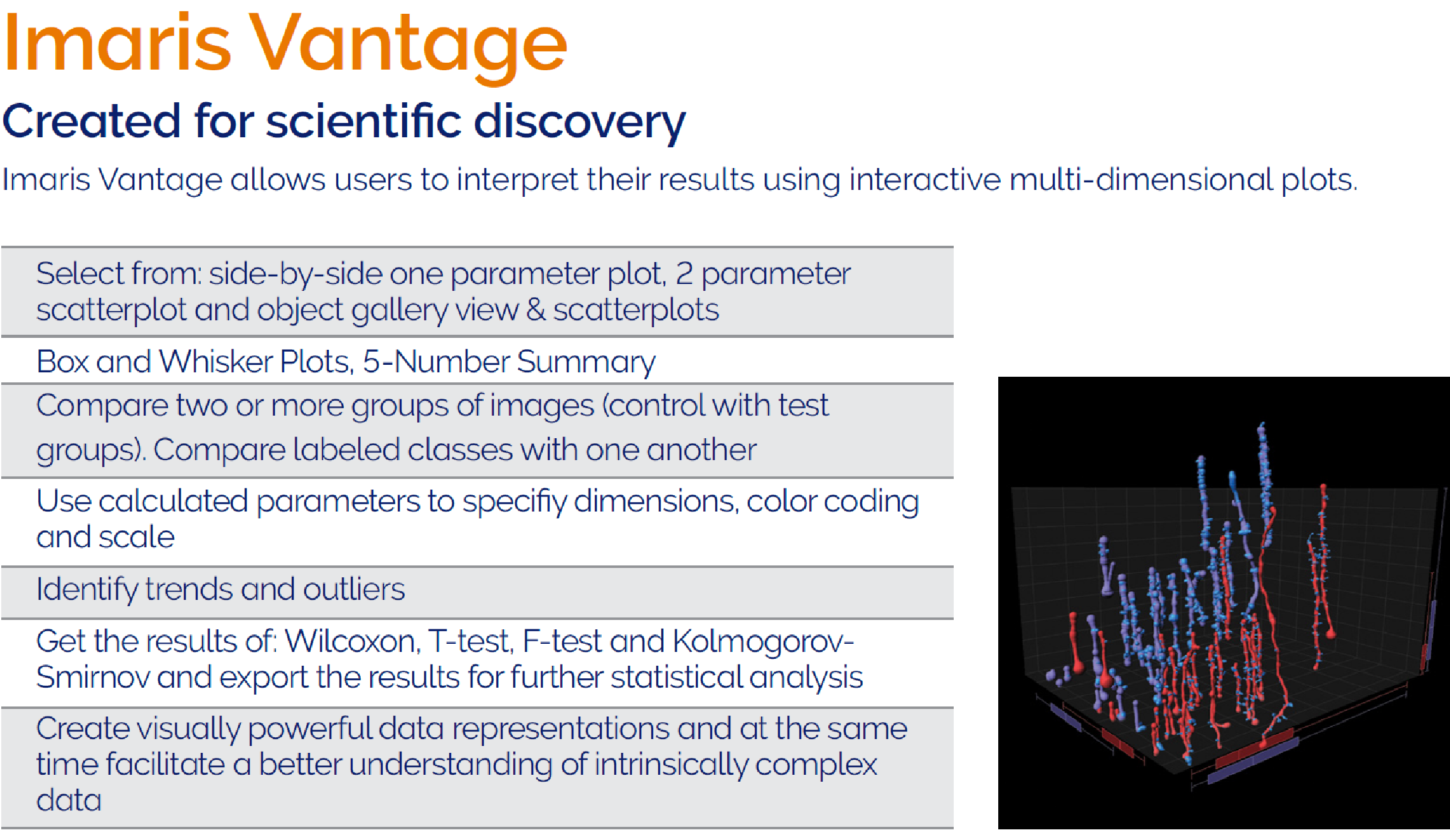 | Imaris Vantage - Plot in 1D-4D, compare groups with statistical tests | ✓ | ✓ | ✓ | ✓ | |