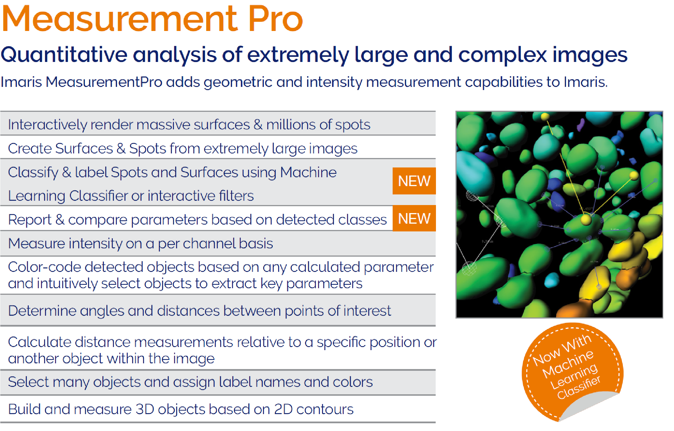 圖像定量分析的重要工具 通過 Imaris Measurement Pro 模組進行幾何和強度測量,從而 得到定量結果! . 得到點和表面的體積,表面積,橢圓性參數,球化率等結果,並即時展示和輸出. . 精確測量每個 Channel 多個物體的強度值 . 提取或刪除感興趣物體以及相關的定量參數 . 進行基於統計結果的排序和分類 . 在感興趣物體內任意位置添加多個點,可以得到他們之間的距離 . 基於 2D 的感興趣區域可以生成 3D 視圖,並同時得到 3D 測量結果
