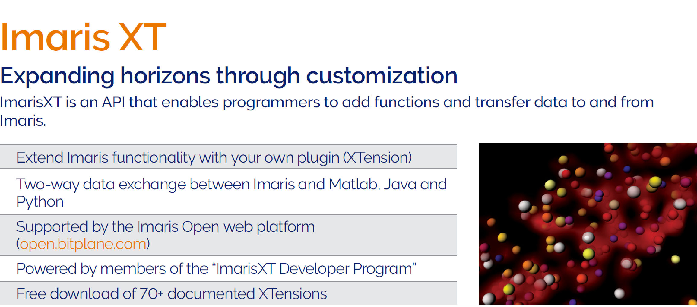 顯微圖像計算方法的革新 ImarisXT通過與其它經典軟體的交互調用,實現了多功能拓展, 為您的實驗提供更多的計算方法! . 探測前沿科研未知參數的工具,回答您最想要知道的問題 . 在影像處理,分離,分類以及報告等方面增加更多的計算方法. . 新功能與常用介面無縫整合,方便用戶調用 . 流暢的與 Matlab,Java,C++,C#,Visual Basic 以及其他經由 COM 的軟體互相 導入資料 . 模組內置了其他人員開發的常用計算方法 . 實現電腦技術與生物研究的完美整合