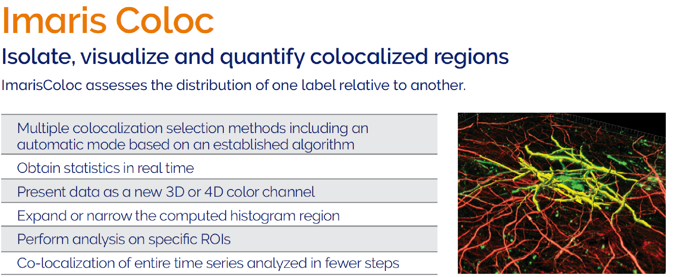| Imaris Coloc - Visualize and quantify colocalized regions | ✓ | ✓ | ✓ | ✓ | |