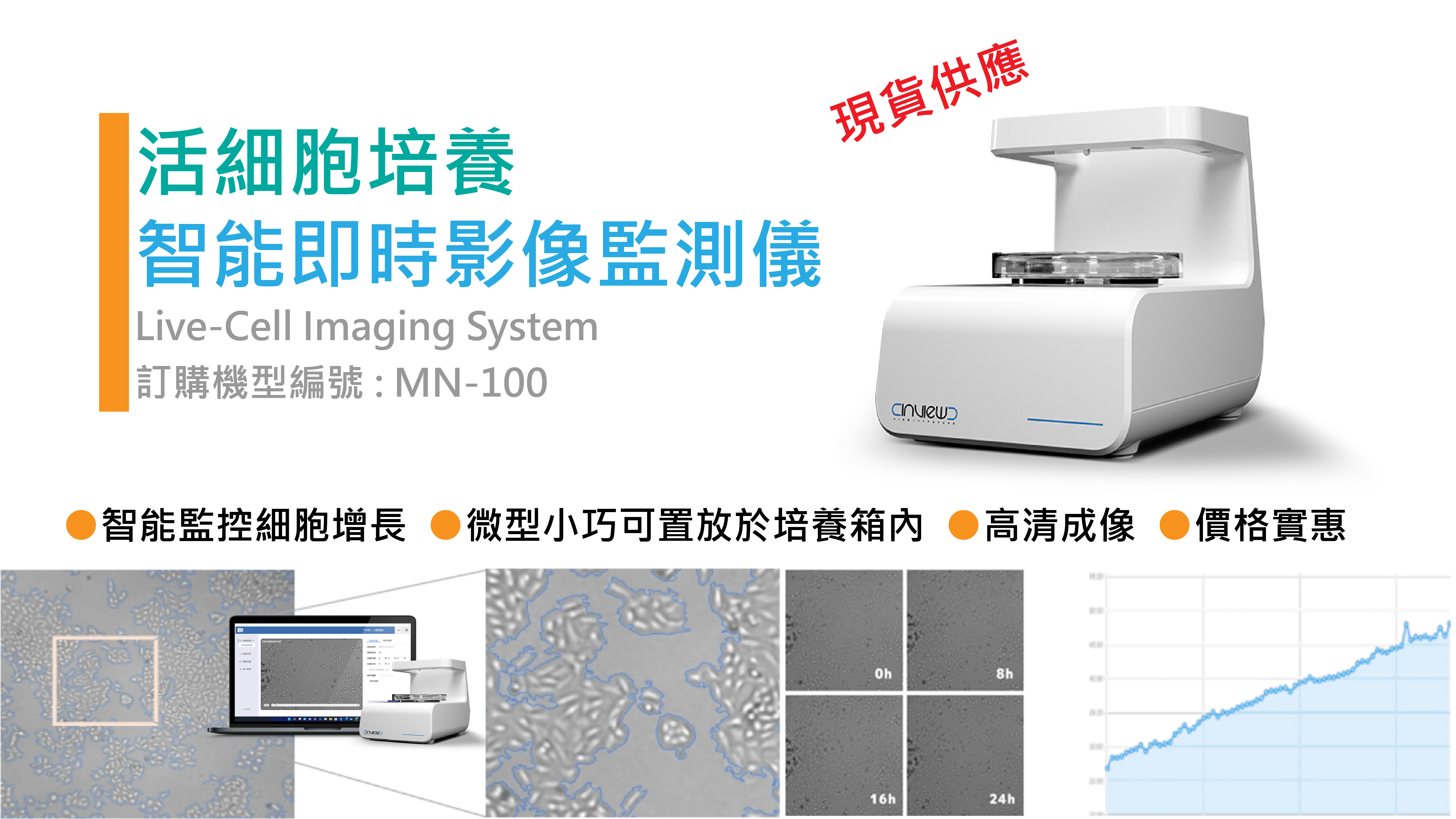 即日起, 我們公司提供一款性價比超高的智能型, 活細胞成長即時監視分析用的檢視顯微鏡. 訂購機型 MN-100, 是一個微型輕巧, 可以放進培養箱即時監測細胞生長的細胞智慧監控助手,兼具輕巧緊湊、易用性好、經濟性優的優勢,集高清顯微成像、7x24小時即時監測、智慧圖像分析、觸線郵件提醒、視頻回溯等功能于一體,完美適用於細胞劃痕、匯合度識別、類器官培養監測、腫瘤球增殖監測、胚胎幹細胞生長監測等大多數細胞生長研究,為細胞質量控制和監控提供了一站式的解決方案.